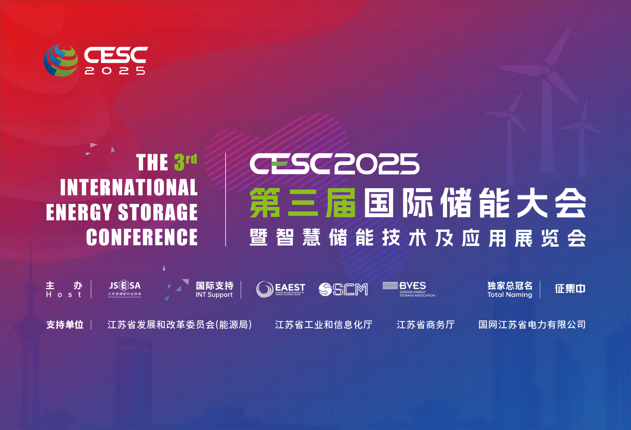 CESC2025第三屆中國江蘇南京國際儲(chǔ)能大會(huì)暨智慧儲(chǔ)能技術(shù)及應(yīng)用展覽會(huì)將為您提供一個(gè)展示自我、拓展業(yè)務(wù)、學(xué)習(xí)交流的絕佳平臺(tái)。誠摯地邀請您參與CESC2025第三屆中國江蘇南京國際儲(chǔ)能大會(huì)暨智慧儲(chǔ)能技術(shù)及應(yīng)用展覽會(huì),無論是參展、參會(huì)、參觀,還是尋求商務(wù)合作,期待您有備而來,滿載而歸!