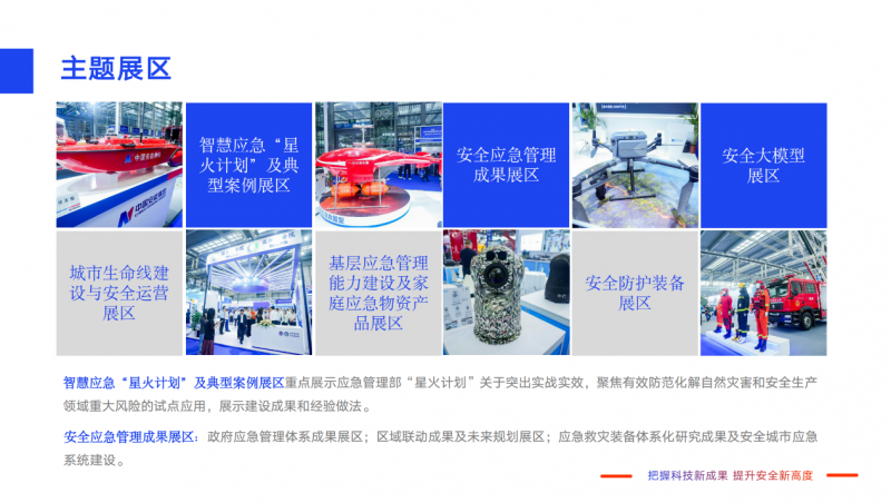 政府應急管理體系成果展區(qū);區(qū)域聯(lián)動成果及未來規(guī)劃展區(qū);應災裝備體系化研究成果及安全城市應急系統(tǒng)建設。