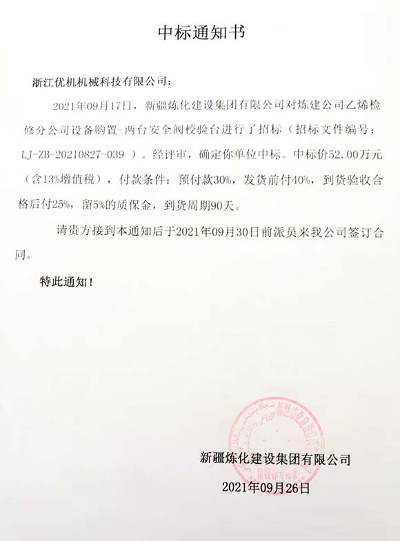 浙江優(yōu)機(jī)再次成功中標(biāo)中石油新疆煉化建設(shè)集團(tuán)閥門試驗校驗項目